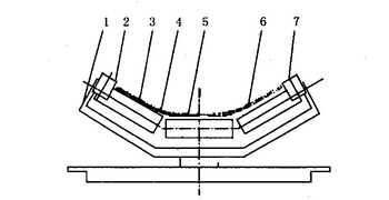 1-旋轉(zhuǎn)架 2-左擋輪 3-左輥輪 4-輸送帶 5-中托輥 6-右托輥 7-右擋輪